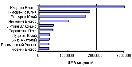 Политики, вошедшие в первую десятку по интенсивности медиаприсутствия в печатных СМИ, представлены на рис. 1. Здесь устойчиво лидирует президент Украины Виктор Ющенко. Соответственно на 40% и на 46% менее интенсивно в СМИ "присутствовали" экс-премьер-министр Украины Юлия Тимошенко и новый премьер Юрий Ехануров.