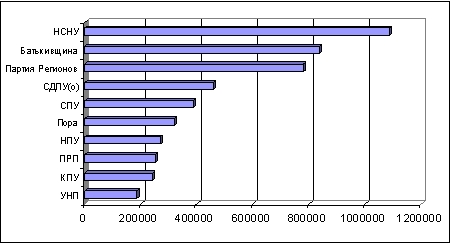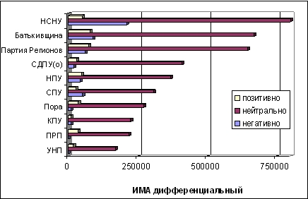 | Рис. 3. Медиарейтинг 10 наиболее часто упоминаемых в печатных и интернет-СМИ политических партий (период с 26.09. по 01.10.2005, данные информационно-консалтинговой компании "Коминформ"). Лидерство НСНУ при максимальной суммарной интенсивности представленности в СМИ сопровождалось превышением уровня негативных оценок над позитивными примерно в 4 раза. |