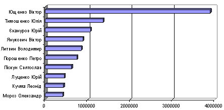 Примерно в 4.5 раза менее интенсивно по сравнению с Ющенко были представлены Виктор Янукович и спикер Владимир Литвин.