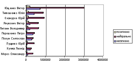 У таких безусловных лидеров медиапопулярности как Ющенко и Тимошенко их негативная представленность соответственно в 4 и в 4.6 раза преобладает над их позитивной представленностью в печатных СМИ.