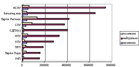 Особенно выраженное преобладание позитива над негативом, также как и в предшествующую неделю, наблюдалось в представлении партии Регионов (в 4 раза) и СПУ (почти в 3 раза).