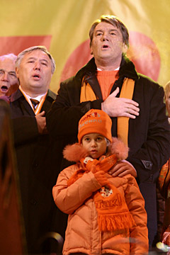 Ющенко вийшов на сцену після двох оголошень разом з усією родиною. Обличчя людей були радісні, але особливого скандування імені президента не було.
