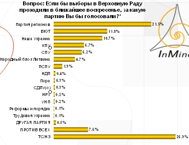 По состоянию на ноябрь на выборах победила бы Партия регионов с 21,5%. Блок Тимошенко получил бы только 11,8%, а "Народный союз Наша Украина" - 10,7%. Не надо быть большим математиком, чтобы подсчитать, что вместе они набирают только чуточку больше (22,5%), чем сила Януковича.