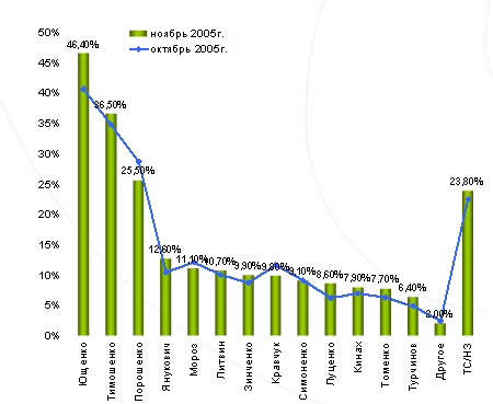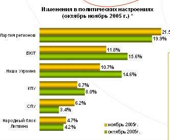 Так, сила Януковича с октября (19,9%) укрепила свои позиции на 1,6%. А вот количество приверженцев партий Ющенко и Тимошенко за этот период уменьшилось более радикально и в почти одинаковой пропорции. Обе силы потеряли за последний месяц 3,9% и 3,8% соответственно.