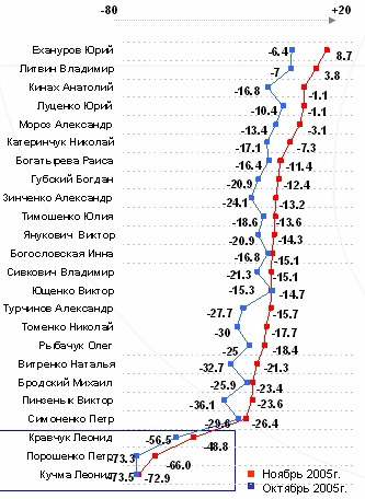 Как и раньше, наибольший рейтинг недоверия имеют Кучма (-72,9%), Порошенко(-66) и Кравчук (-48).