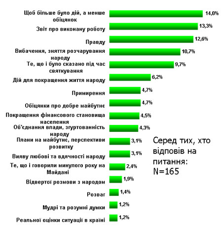 Среди тех, кто смог ответить на вопрос о своих ожиданиях, наиболее популярные темы для выступлений на Майдане – это "больше действий, меньше обещаний", отчет о проделанной работе, "правда", а также извинения.