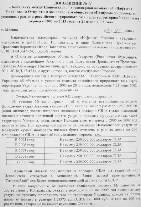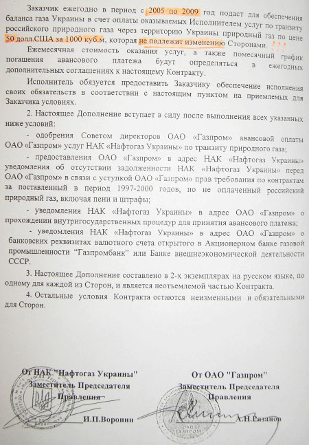 Он подчеркнул, что стороны подписали "дополнение к контракту, где четко прописано, что "Газпром" обеспечит баланс газа Украины до 2009 года включительно, при этом цена газа составит $50 за 1 тыс. кубометров".