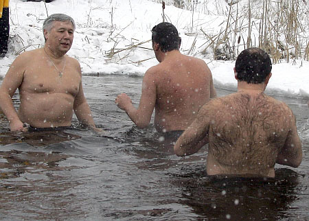 А вот лидер Партии регионов Виктор Янукович испытать свое тело ледяной водой не рискнул. В теплой шапке и в обществе закутанных в платки бабушек, Янукович посвятил воду в Киево-Печерской Лавре. И помолился. За тех, кто в проруби.