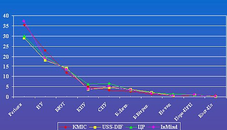 Если теперь вернуться к первому графику, к рейтингам профессиональных центров, то видно, что значимые различия есть только по партии Регионов. Причём данные КМИСа практически полностью совпадают с данными ИнМайнда, а данные USS-DIF совпадают с данными Центра Разумкова.