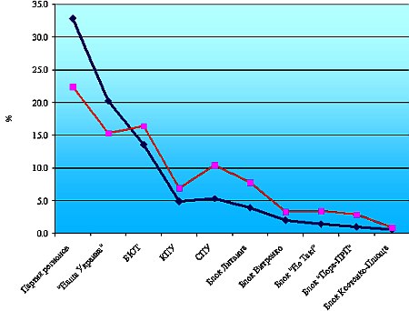 Никто не утверждает, что лидером является, скажем, блок Марчука или коммунисты, или Пора-ПРП. А почему, собственно? Блок Марчука, скажем, возглавляет известный политический лидер, программа не хуже, чем программа других партий… Что мешает утверждать, что её рейтинг, допустим, 32%? Данные социологических исследований?