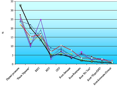 В общем, никто не ставит под сомнение основные результаты социологических исследований последнего месяца: наибольшие шансы попасть в парламент имеют 6 партий: "Регионы", "Наша Украина", БЮТ, социалисты, коммунисты, блок Литвина. Лидируют Регионы, на втором месте "Наша Украина" и БЮТ, сохраняют шансы попасть в парламент ещё несколько блоков - в частности, блок Витренко, "Не так", Пора-ПРП, блок Костенко-Плюща и др.