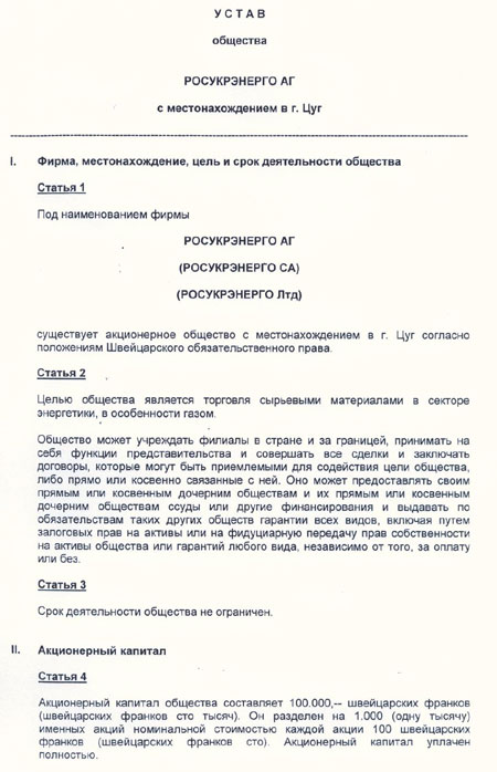 Впрочем, устав "РосУкрЭнерго" проливает свет на некоторые аспекты деятельности компании. Этот документ был нами получен из надежных конфиденциальных источников.
