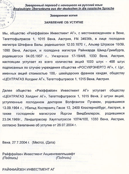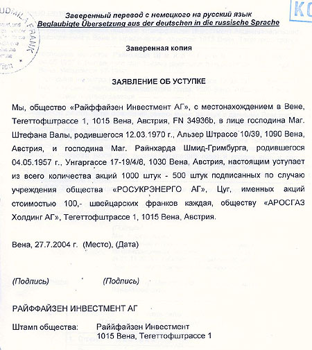Приведенные ниже документы касаются начала деятельности этой компании в 2004 году, и здесь нет упоминания о якобы совладельцах "РосУкрЭнерго" с украинской стороны, которые стали известны в среду – бизнесменах Дмитрия Фирташа и Ивана Фурсина.