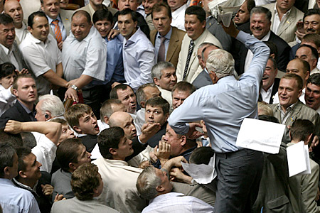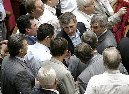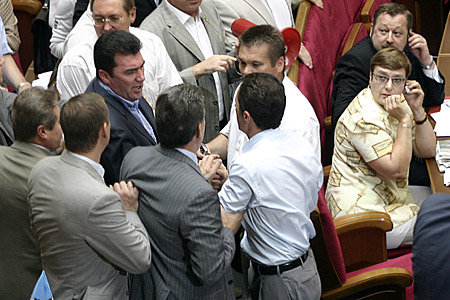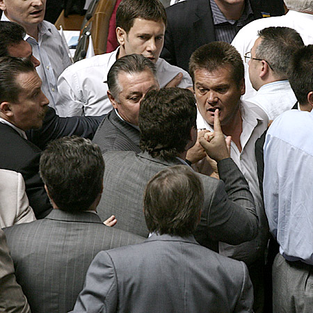 Потасовка закінчилась нічим, і депутати перейшли на словесну бійку. Регіонали кричали "Морозу-слава", "Юлю геть". У відповідь "Наша Україна" і БЮТ скандували "Морозу ганьба", "Мороз - Іуда!".