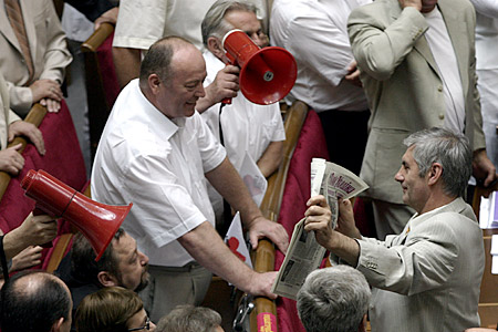 За цим голова Верховної Ради оголосив перерву. Але депутати залишились на місцях: хто - стерегти президію, хто - заносити мегафони.