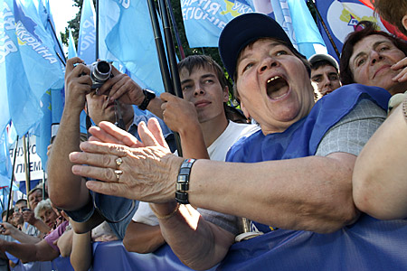 Крім того, дехто з прихильників приніс саморобні транспаранти, на кшталт: "Юля, не плачь, зато ты красивая", "Галичина за Януковича". Почалися співи "Вставай, страна огромная", "Любимый город, можешь спать спокойно".