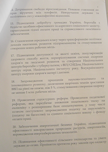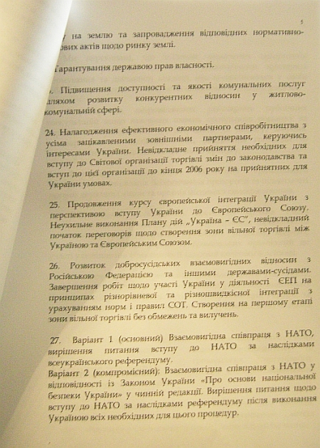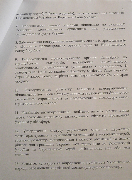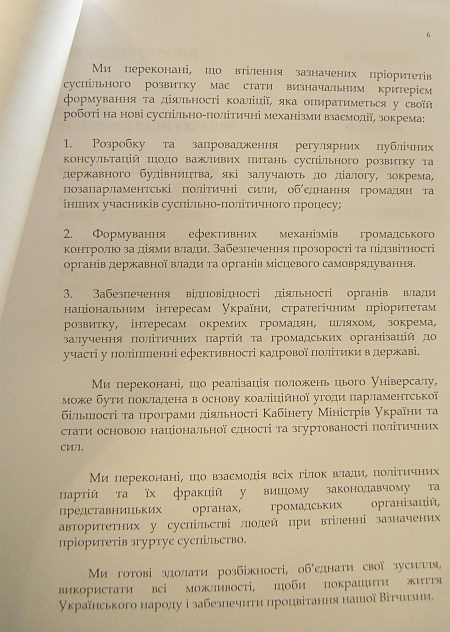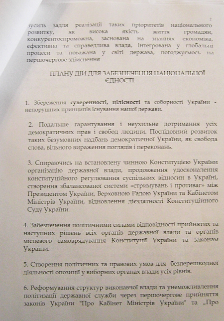 Вообще план действий в универсале предусматривает 27 пунктов. В проекте документа сказано, что положения этого универсала могут быть взяты в качестве основы коалиционного соглашения и программы деятельности Кабинета министров.