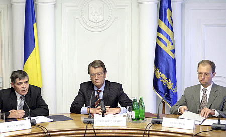 | Ющенко и Петр Пилипчук (слева). На встрече впервые в своем новом качестве присутствовал Арсений Яценюк. Фото пресс-службы президента |