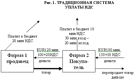 По традиционной системе (рис.1) покупатель заплатит поставщику EUR120 млн. (EUR 100 млн. + EUR20 млн. НДС). При этом у продавца (фирмы 1) появляется обязательства по входящему НДС на EUR20 млн., а у покупателя (фирмы 2) появляется право на компенсацию исходящего НДС тоже на EUR20 млн. После того как фирма 2 осуществит дальнейшую реализацию товара на EUR180 млн (EUR150 млн + EUR30 млн. НДС), она заплатит в бюджет EUR10 млн. (EUR30 млн. исходящго НДС минус EUR20 млн входящего НДС).