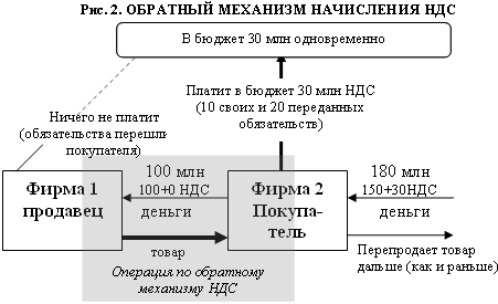 Для рисунка 2 это означает, что фирма 1 отчитывается финансовым органам о том, что передала свои налоговые обязательства фирме 2 (то есть входного НДС не получала, и он остался у фирмы-покупателя) и соответственно перечислять деньги казначейству не должна.