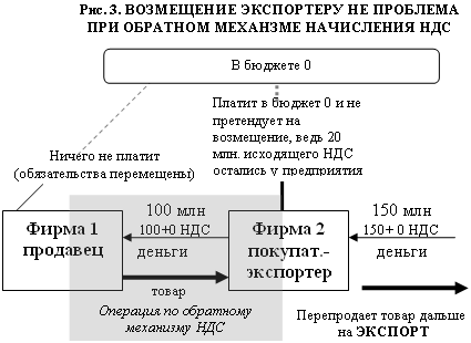 1. Нет необходиости в возмещении НДС. Если фирма 2 перепродает товар на экспорт, то при действующей системе она будет иметь право на возмещение EUR20 млн. Тогда, в рамках нашего примера выходит, что EUR20 млн., которые будут перечислены в бюджет первой фирмой (продавцом), пойдут на возмещение экспортеру (второй фирме).