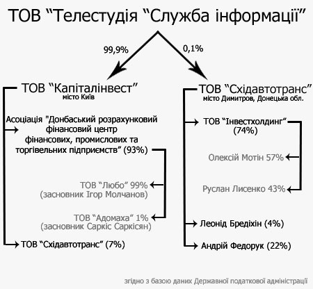 По словам Ильяшенко, у "Капиталинвеста" 99,98% акционерного капитала НТН. Хотя эта фирма указана как киевская, но контрольный пакет акций принадлежит ассоциации "Донбасский расчетный финансовый центр финансовых, промышленных и торговых предприятий". Миноритарный пакет "Капиталинвеста" – у все того же "Схидавтотранс".
