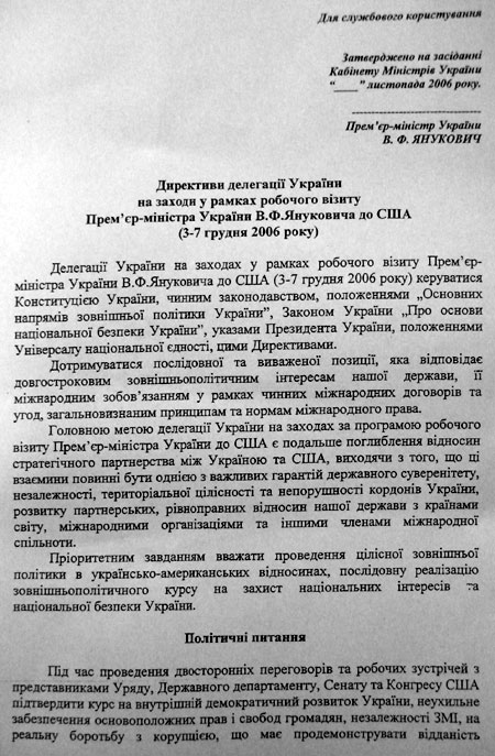 Текст директив к визиту премьера в США, из-за каких поссорились Ющенко и Янукович