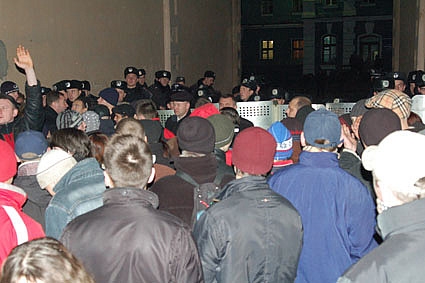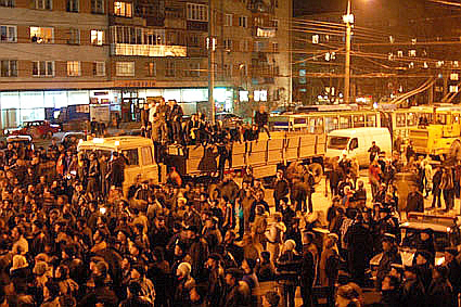 Далее события разворачивались в центре. В 22 часа толпа из нескольких сотен протестовала под городским отделением милиции.