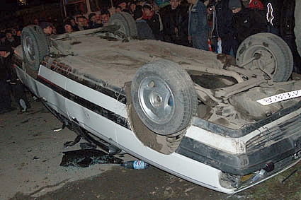 Люди с криками перевернули милицейскую машину, в которой был виновник аварии и один из свидетелей. Вскоре прибыла мать водителя, которая вытянула сына из машины.