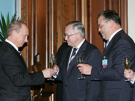 Після цього до зали занесли шампанське. Ющенко пішов зі своїм бокалом чокнутися з росіянами, Путін попрямував до українських міністрів.