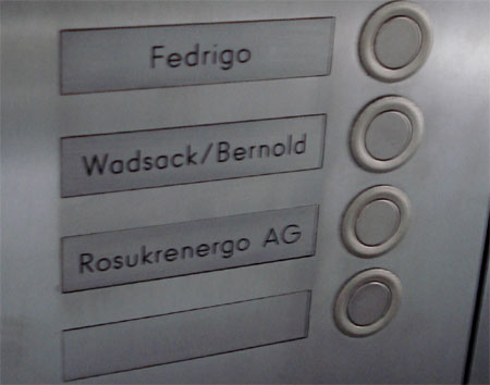 На первом (по европейской нумерации) этаже этого небольшого делового центра расположены восемь фирм, одна из которых – "РосУкрЭнерго".