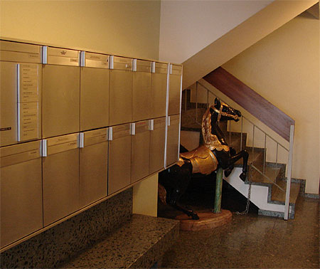 Итак, самый первый офис "РосУкрЕнерго" был расположен в четырехэтажном здании, где большинство помещений являются жильем обыкновенных жителей Цуга. Например, при входе вас здесь встречает… лошадка, снятая с детской карусели.