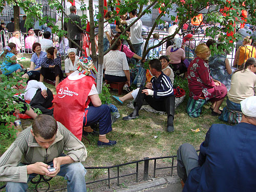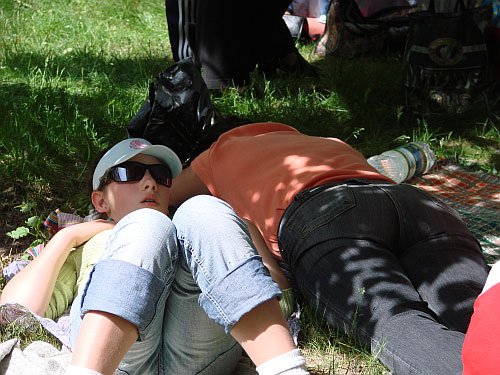 Но разгневанные народные массы не выдержали под солнцем. Митингующие вместо того, чтобы выкрикивать призывы к Ющенко уути в отставку, легли... спать. Прямо на углу улиц Банковой и Лютеранской.