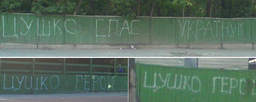 Те же слова каким-то странным образом в последние дни поселились и на заборах украинских городов. Вместо нецензурной лексики теперь на них можно увидеть надписи: "Цушко – герой!".