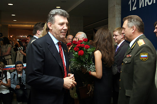В начале концерта Черномырдин, как водится, коротенечко произнес доклад о последних успехах России. На время его речи потухли два боковых экрана, непрерывно рекламирующие "Росукрэнерго" и других спонсоров приема.