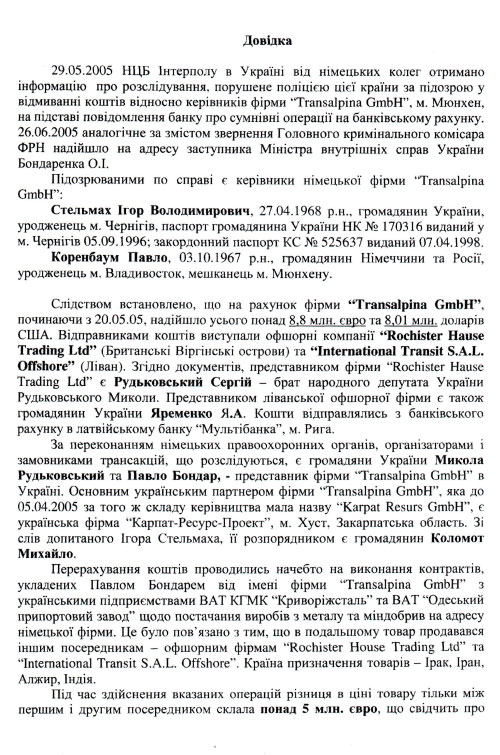 "На переконання німецьких правоохоронних органів, організаторами і замовниками трансакцій, що розслідуються, є представник фірми "Rochister Hause Trading Ltd" в Україні Павло Бондар та Микола Рудьковський", - сказано в міліцейській довідці.