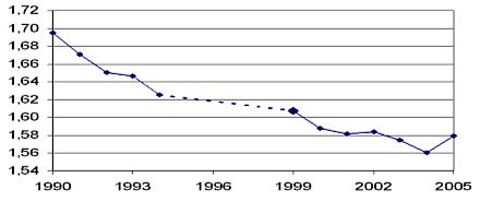 Мы опирались на статистику 2003 - 2004 года, когда состоялось резкое сокращение рождаемости (см. Таблицу) при необходимости увеличения индекса рождаемости - только для сохранности простого воспроизведения нации необходимо 2,2 ребенка на каждую полную семью.