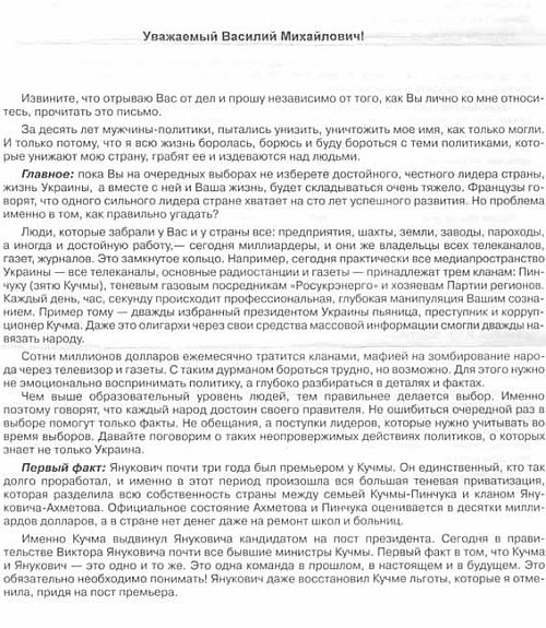 Недавно в руки УП попало письмо от имени Тимошенко, распространяемое в восточных областях. В нем ЮВТ пытается убедить восточного избирателя, что Янукович – это продолжение Кучмы. Что не стоит поддерживать человека больше всех проработавшего на посту премьера, но так ничего и не сделавшего для людей.