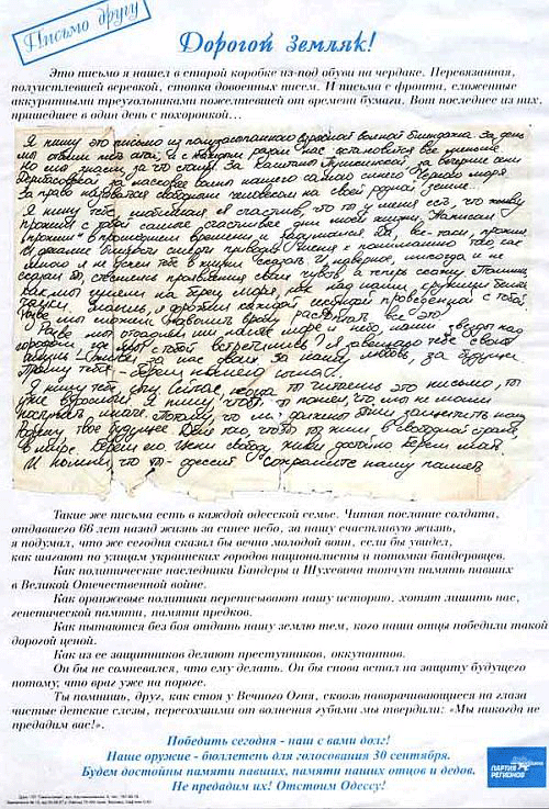Оно состоит из старого письма солдата времен второй мировой и пылких призывов регионалов не допустить ко власти оранжевых, "пытающихся переписать историю, лишить нас генетической памяти, памяти предков".