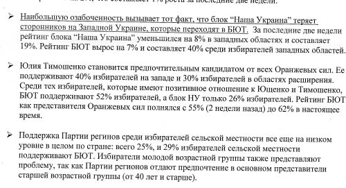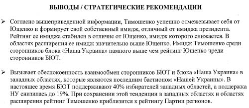 3. Необходимо разработать и использовать мессидж, направленный на "антироссийскую" политику, которую проводит Тимошенко, а также организовать агитационную кампанию на местах в целевых областях. Это вызывает некоторые трудности, потому что сторонники Коммунистической и Социалистической партии Украины должны считать, что Тимошенко смогла бы снова стать премьер-министром и продолжить политику противодействия отношениям с Россией".