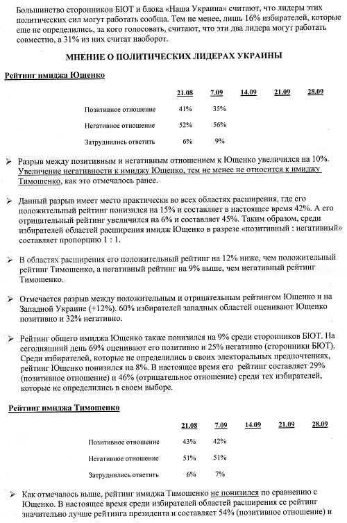 В отчете отдельным пунктом подчеркивается, что "Тимошенко успешно отмежевывает себя от Ющенко и формирует собственный имидж, отличный от имиджа президента".