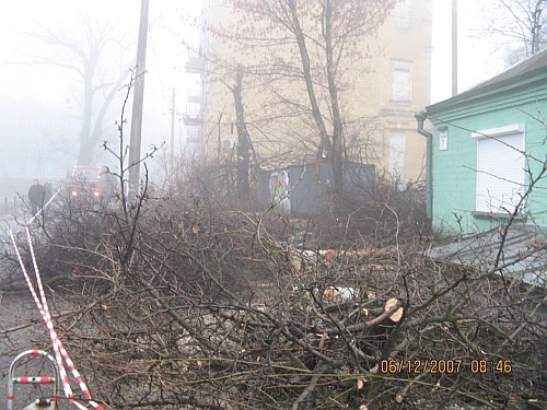 Жители снова вызвали милицию. А тем временем началась физическая потасовка. И что интересно: кроме собственно рабочих, на месте появились пятеро мордоворотов-наемников, как их назвал Сергей. Хорошо тренированные юнцы стали шеренгой и оградили жителей близлежащих домов, а тем временем рабочие подгоняли кран и намеревались пилить следующее дерево.