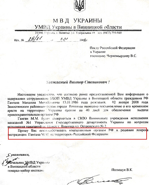 А в это время другой подчиненный министра – начальник управления внутренних дел в Винницкой области генерал-майор В.К. Полищук отправляет факсом послу России в Украине странные депеши с просьбой интенсифицировать деятельность по экстрадиции Гангана…