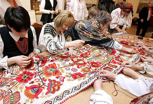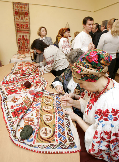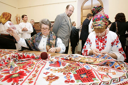 Екатерина Ющенко вместе с киевскими вышивальщицами закончила девятиметровое полотно, которое на протяжении года создавалось мастерами народного творчества со всех регионов Украины.