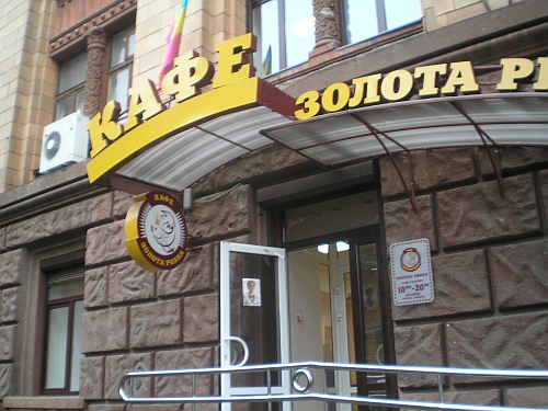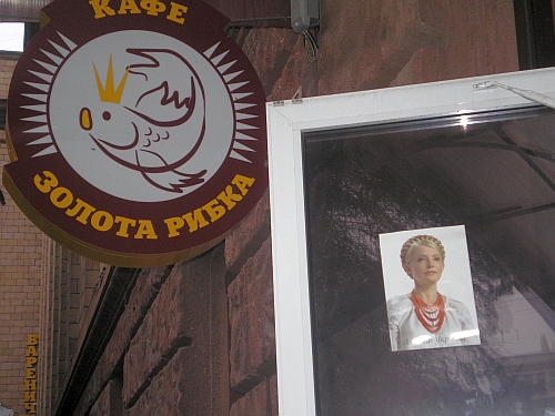 А вот в кафе "Золотая рыбка" с порога можно догадаться о связях владельцев со своей знаменитой родственницей: над входной дверью "Золотой рыбки" висят государственный желто-голубой флаг и белый с красным сердцем флаг БЮТа. А на входной двери как снаружи, так и внутри красуются портреты самой Юлии Владимировны в коралловом ожерелье.