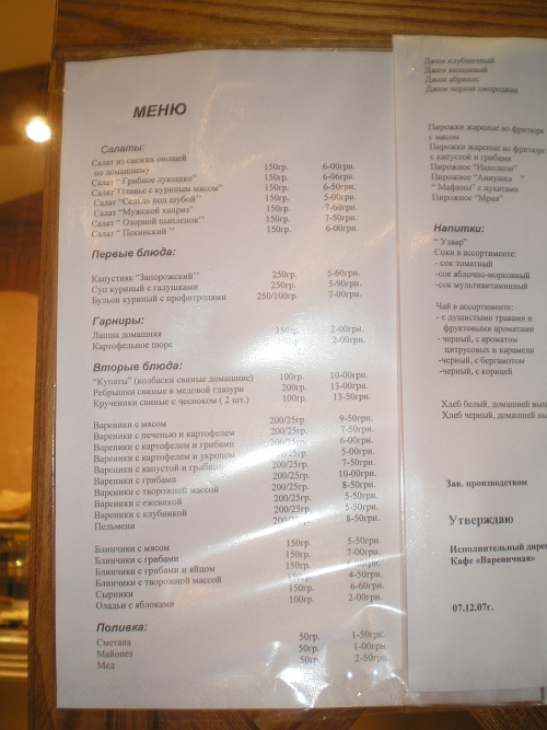 Угощают в вареничной Евгении Карр капустником за 5,6 грн., свиными реберцами с медом за 13 грн., кручениками со свинины за 13,5 грн., которые являются самым дорогим блюдом в меню, разнообразными салатами от 6 грн. до 7,6 грн., блинами с начинкой по цене от 4,5 грн. до 7 грн., творожниками за 6,50 грн. и в конце концов варениками с мясом, картофелем, печенью, сыром, клубникой и ежевикой от 5 грн. до 10 грн.