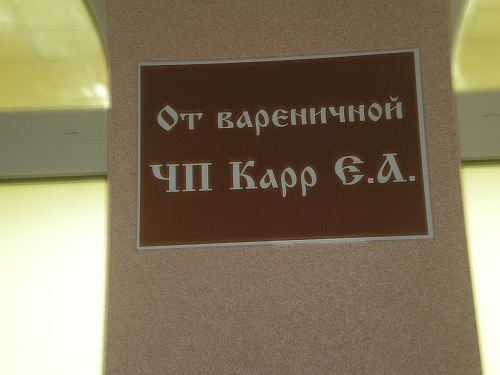 Также у вареничной единственной дочери Юлии Владимировны есть небольшой филиал в помещении смежном с кафе "Золотая рыбка": это небольшая кондитерская, где продаются пирожки и другая выпечка. Над стеклянной витриной этой лавочки есть табличка с надписью, которая указывает на личность его хозяйки: "От вареничной ЧП Карр Е.А."