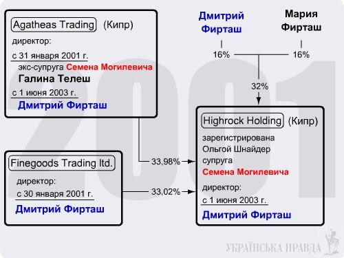 Учредителями Highrock Holding Ltd выступили Марина Калиновская (15,99%), Дмитрий Фирташ (16,99%) и два юридических лица - Finegoods Trading Ltd и Agatheas Trading Ltd.