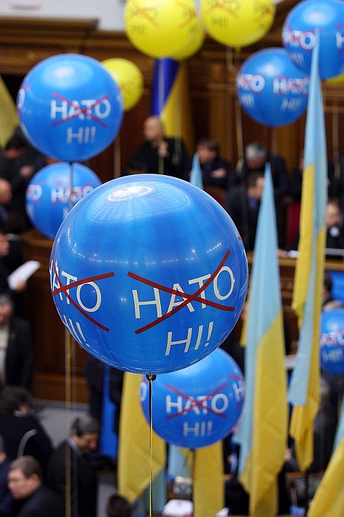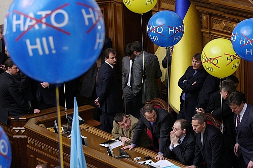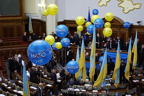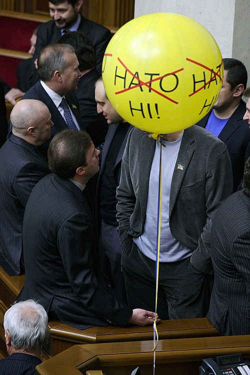 Сессионный зал украсили не просто лозунгами "НАТО – нет!", но и желтыми и синими шариками с аналогичными надписями.