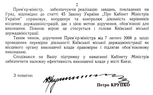 "Таким образом, поручение премьер-министра от 7 февраля 2008 относительно проведения проверки деятельности КГГА как местного органа исполнительной власти правомерно и подлежит немедленному выполнению", - написал Крупко.